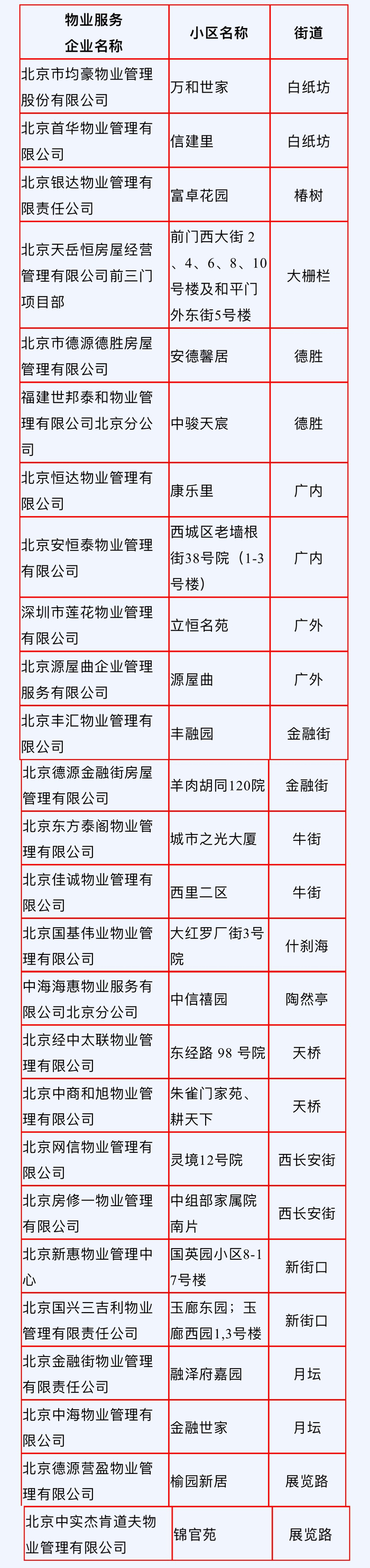 2022年西城区物业企业服务质量好评榜