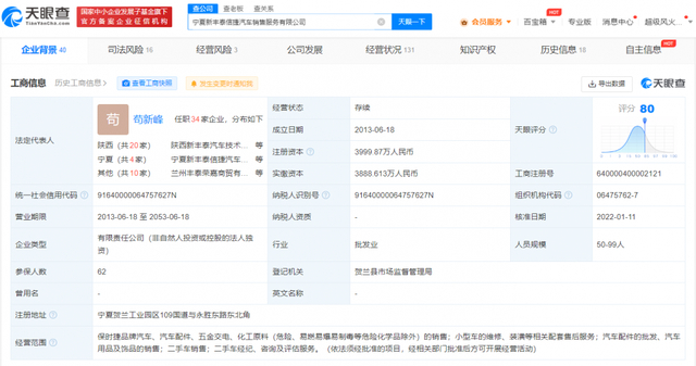 天眼查App显示,宁夏银川保时捷中心关联公司为宁夏新丰泰信捷汽车销售服务有限公司。该公司成立于2013年6月,法定代表人为苟新峰,注册资本3999.87万人民币,经营范围包括保时捷品牌汽车、汽车配件、五金交电、化工原料的销售等,由陕西新丰泰汽车技术开发有限责任公司全资持股。风险信息显示,该公司曾两次因消防问题被处罚,合计罚款3.5万元。此外,该公司存在多起买卖合同纠纷。
