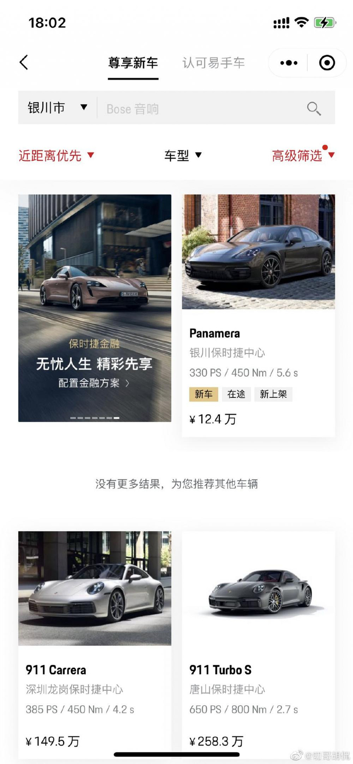 1月30日,银川保时捷中心上线了12.4万一辆的Panamera,首付低至3万,博主@叨哥胡侃支付了911元的订金抢购,随后保时捷下架此车,并将911元订金退回。