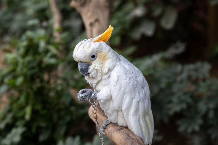 在鹦鹉园里,树林密布,空气潮湿,热带雨林的潮湿味道扑面而来,空气中不同种类鹦鹉种类的叫声此起彼伏。树林间的空当处小朋友们拿着勺子在给鹦鹉喂食。“大点鹦鹉爱吃瓜子,小的鹦鹉爱吃小米,这个彩色的叫吸蜜鹦鹉........”市民范先生带着女儿边喂食鹦鹉边为她讲解知识。