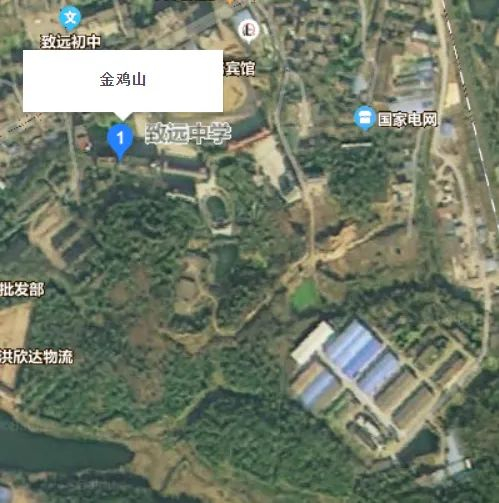 查询地图显示,河口镇金鸡山位于致远中学南侧,直线距离不足百米。