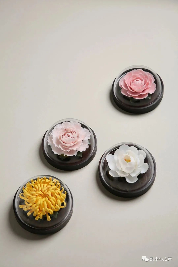 牡丹花的每一片花瓣均为手作,虽是陶瓷,但薄如纸片,细腻温润,花色清透,宛若实物,将精油滴入顷刻飘香。设计师还为每个作品以词牌命名,“莲花是大运河城市济南的市花,用如梦令为名,也是纪念家乡在济南的李清照。”冯建革说。
