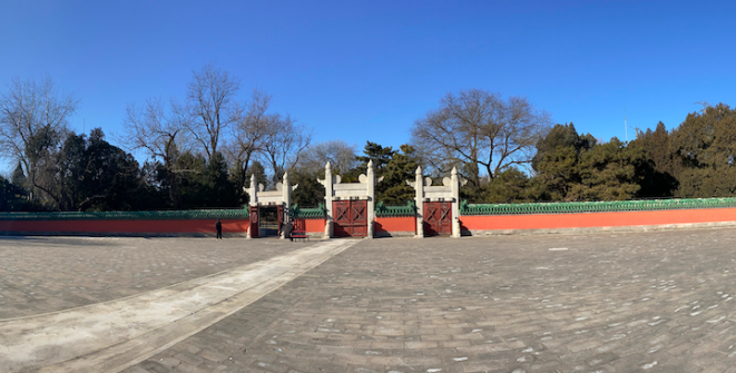 在日坛公园,步行百来米,就能看到被郁郁松柏环绕的圜坛。圜坛四周为一道朱红色的圆形砖墙,正门向西,为三门六柱,南、北、东三面各有一门两柱。自西门走进围墙,庄严气象扑面而来,中央的方形坛壝是明清两代帝王祭拜大明神(太阳神)的祭坛,四边各有九级台阶。因文物保护要求,游客只能在圜坛的围墙内参观,不能登上坛壝。