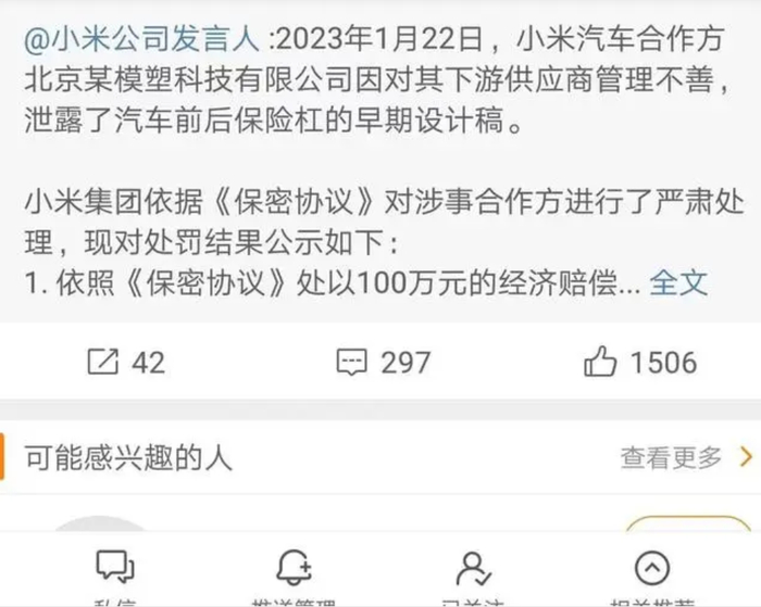 2月2日,小米官方微博@小米公司发言人通报泄密处理结果:1月22日,小米汽车合作方北京某模塑科技有限公司因对其下游供应商管理不善,泄露了汽车前后保险杠的早期设计稿。