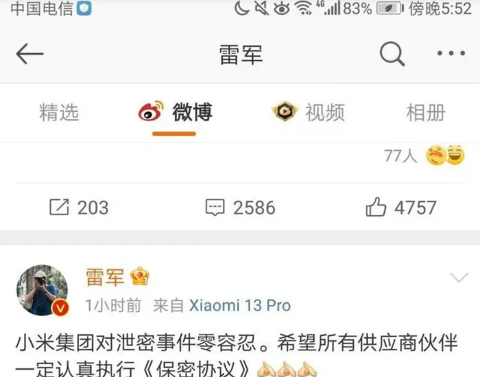 2月2日,小米集团(1810.HK)创始人、董事长兼CEO雷军发微博提到,小米对泄密事件零容忍。希望所有供应商伙伴一定认真执行《保密协议》。