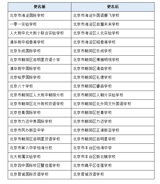 此后,北京越来越多的民办学校加入更名行列,如,北京市海淀国际学校更名为北京市海淀外国语藤飞学校,北京八十学校更名为北京市朝阳区睿森学校,一零一实验学校更名为北京市海淀区启慧未来学校,清华附中稻香湖学校更名为北京市海淀区稻香湖学校,等等。