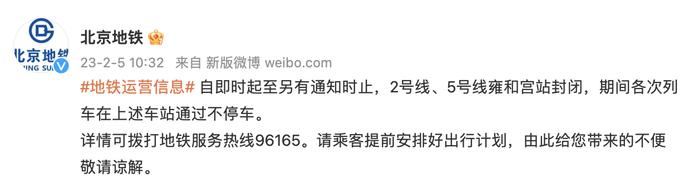 北京地铁:即时起2号线、5号线雍和宫站封闭,列车通过不停车