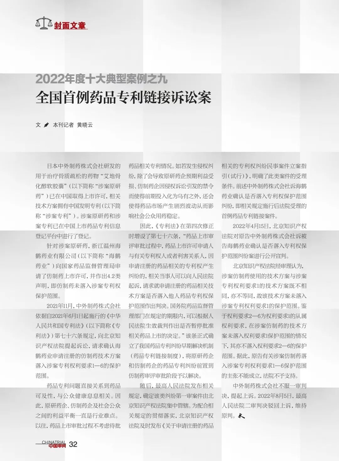 全国首例药品专利链接诉讼案入选《中国审判》2022年度十大典型案例