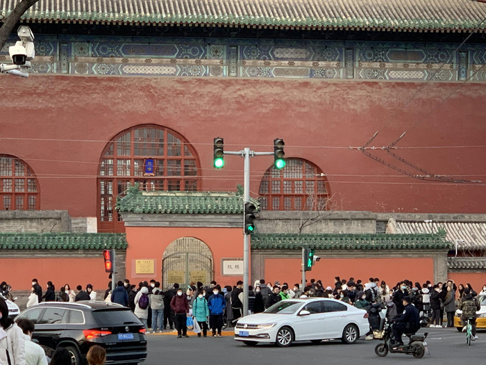 沿着地安门外大街往北走,就来到了三岔路口,在其中一个路口,一名交通协管员站在人行横道上维持秩序。路口两侧依然挤满了拍照的人,有的甚至站到了马路上:红灯时他们在拍照,绿灯时他们还在拍照,交通协管员只能扯着嗓子大喊:“走了走了走了!”“看车看车看车!”