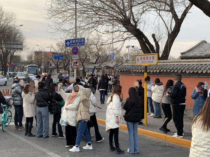 2月8日是工作日,下午4点半左右记者来到鼓楼,在正对鼓楼南门的地安门外大街,200多米长的路段两侧,拍照的年轻人占据着路边的台阶,他们或坐或站,要么和身后红墙绿瓦的高大鼓楼合照,要么等待赵雷歌曲《鼓楼》中提到的107路电车。