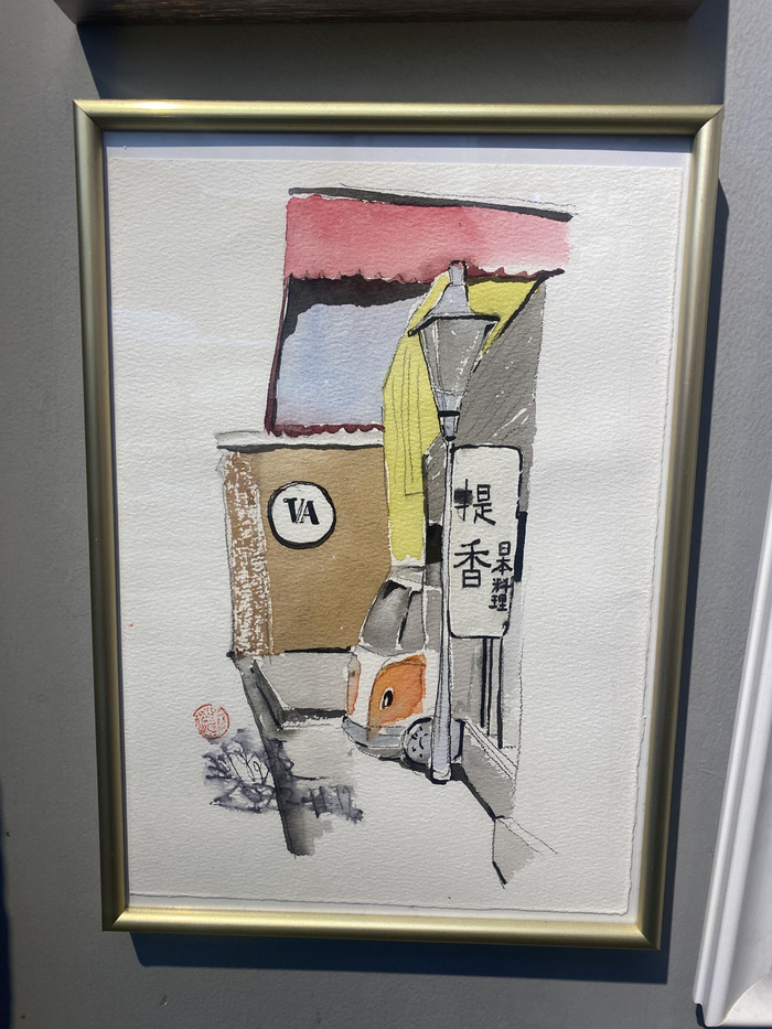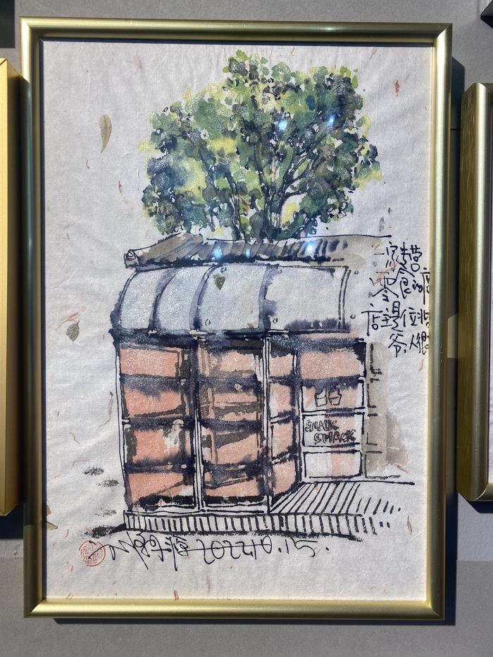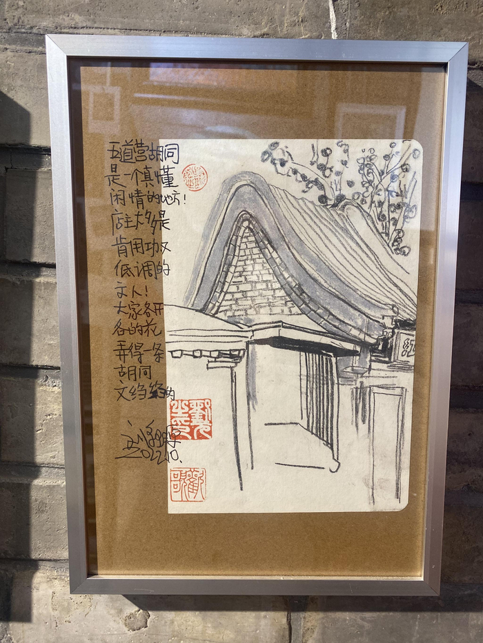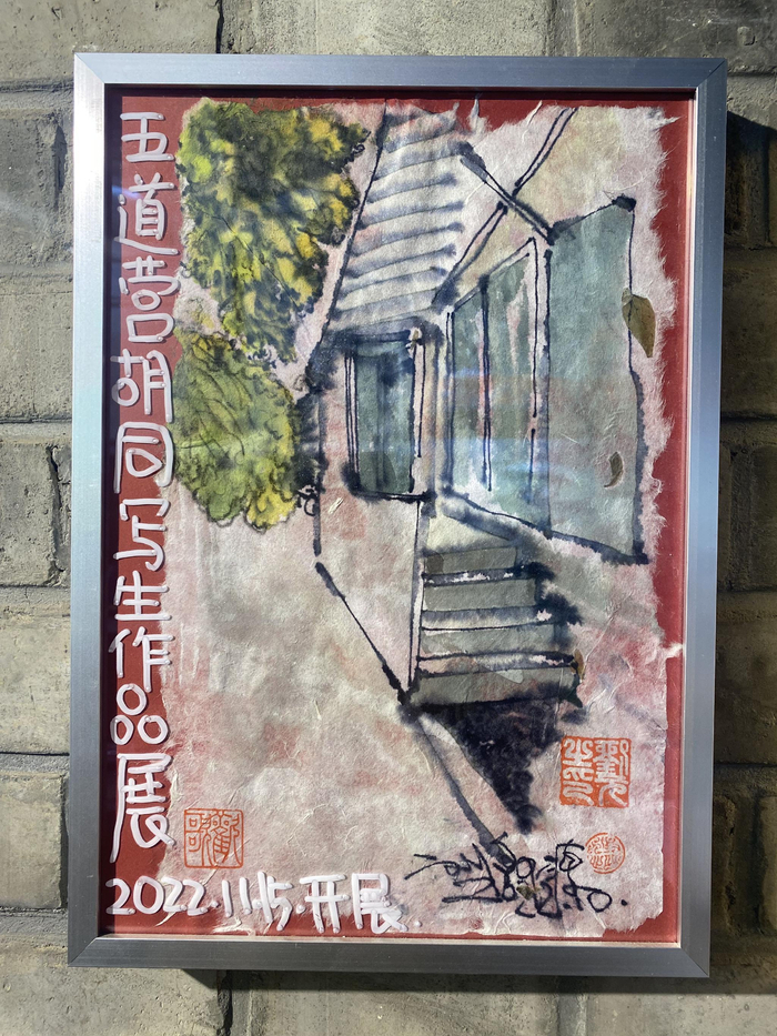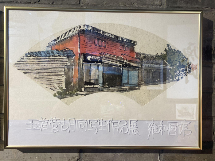 走进画馆,写意抽象的人物画、笔墨清润的山水画、惟妙惟肖的十二生肖印章……映入眼帘。往深走去,一张张五道营胡同各家店铺的写生画铺满墙壁,仿佛再一次游览胡同。