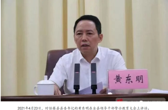 公开资料显示,黄东明出生于1967年,广西岑溪市人。1990年,从广西农学院毕业后参加工作,曾任藤县县委副书记、梧州市经委主任兼市招商局局长;2010年任藤县人民政府县长,2016年任藤县县委书记;2021年9月起任梧州市供销合作社联合社党组书记、理事会主任。