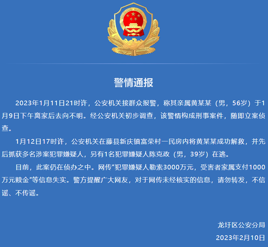 2月10日晚间,梧州市公安局龙圩分局警情通报表示,此案仍在侦办之中。网传“犯罪嫌疑人勒索3000万元,受害者家属支付1000万元赎金”等信息失实。警方提醒广大网友,对于网传未经核实的信息,请勿转发,不信谣、不传谣。