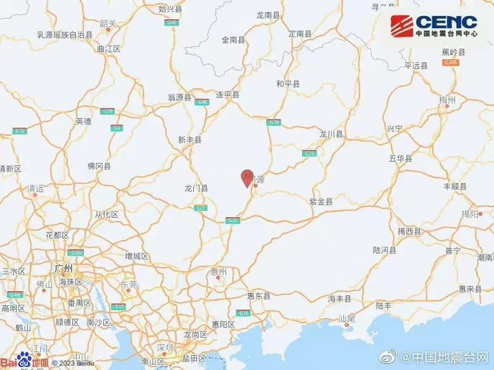 根据中国地震台网正式测定,2月11日10时41分在广东省河源市源城区(北纬23.76度,东经114.64度)发生4.3级地震,震源深度11公里。广东省地震局网站透露,震中位于广东省河源市源城区源西街道附近,距离河源市东源县新港镇人民政府3公里,河源市源城区城区6公里,河源市城区6公里,广州市157公里。