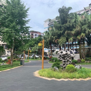 在道路及节点位置上,益寿园新增了中式风格的景观小品、假山凉亭,并新建花架长廊、靠背木质坐凳、手绘景墙,增加了中式风格路灯,并增加了乒乓台、运动器械,将全园地砖更换为生态透水砖,雨天也不湿滑。