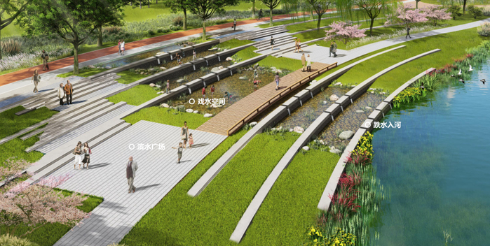 将北侧公园内水系出口设计为跌水广场,以层叠形式将水再次爆气增氧,设置汀步浅水,满足市民亲水需求,提供戏水空间。