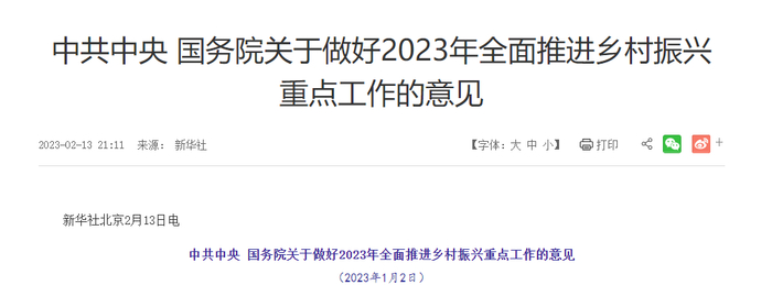 2月13日,21世纪以来第20个指导“三农”工作的中央一号文件由新华社受权发布。