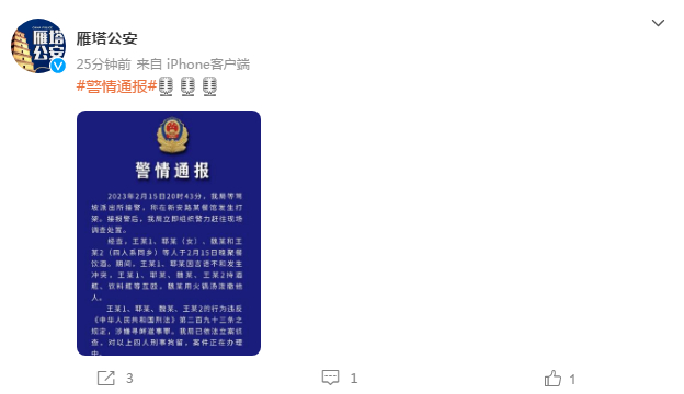 据西安市公安局雁塔分局官方微博发布,2023年2月15日20时43分,该局等驾坡派出所接警,称在新安路某餐馆发生打架。