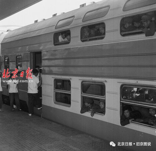1960年,北京火车站,双层旅客列车停在北京车站