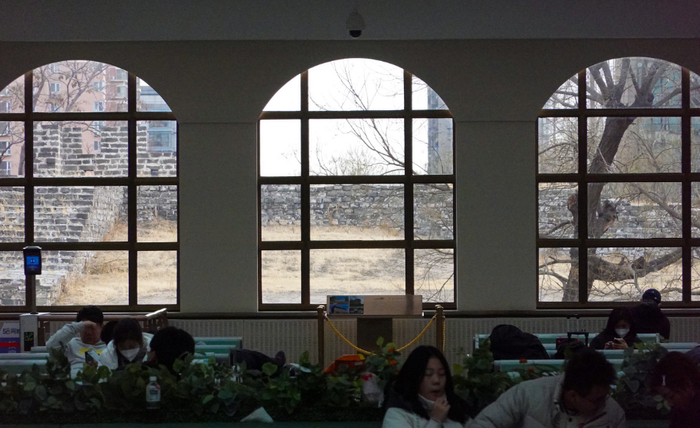 一眼望去,长长的第八候车室尽头,几扇拱形窗户后,可见年代更久远的历史遗迹——明城墙。窗前新立起的铜质名牌上,这样介绍:透过您所在位置的窗口,看到的是北京明城墙遗址的一部分。古老的青砖、夯土,突出展现出城墙的残缺之美,以及古都明城墙的文化内涵和历史风貌。
