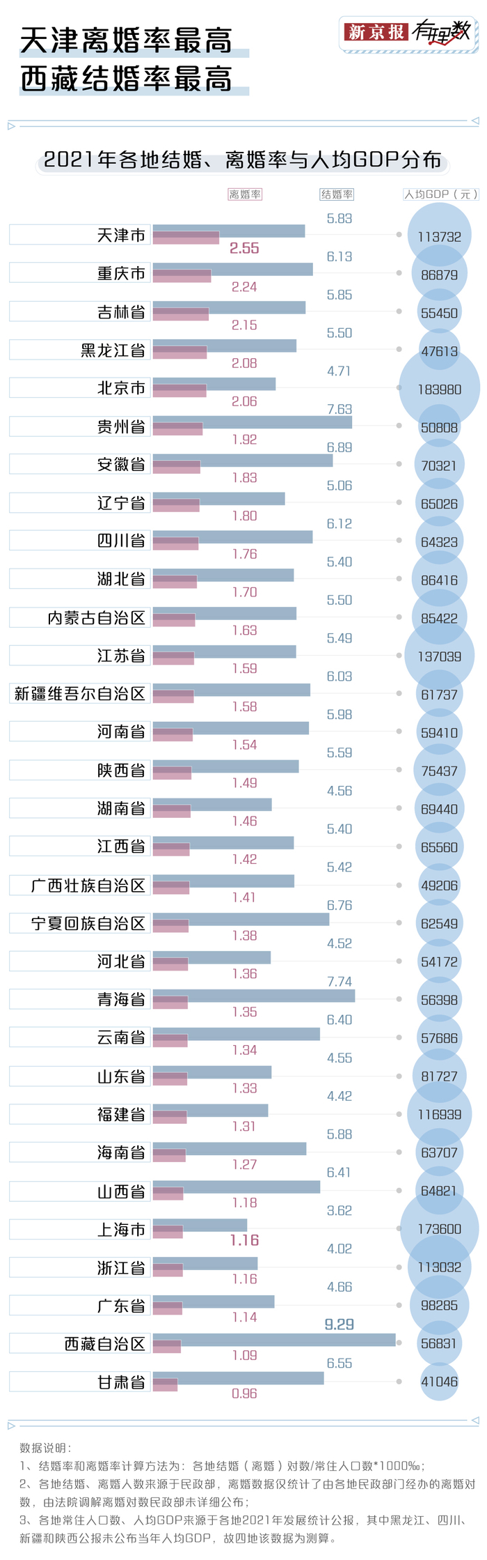 按照民政部数据,2021年全国粗离婚率约为2‰,按照测算,全国共有天津、重庆、吉林、黑龙江和北京五地超过了这个水平,其中天津最高2.55‰排在首位,成为全国离婚率最高的地区,其次是重庆2.24‰和吉林2.15‰。