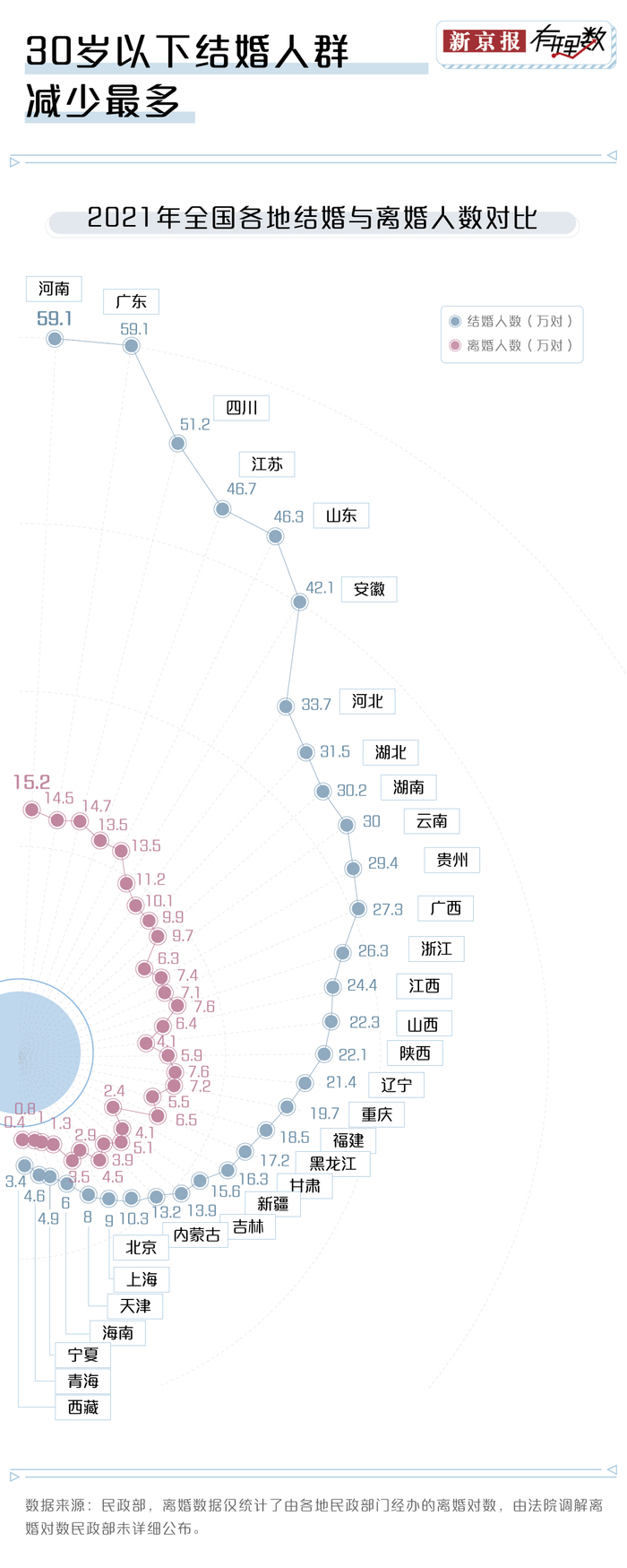 但要衡量一个地区的婚姻稳定状况,仅看离婚人数是不科学的,因为虽然河南离婚人数最多,但河南的登记结婚人数也是全国最多的,以59.1万对的数量和广东省并列首位。
