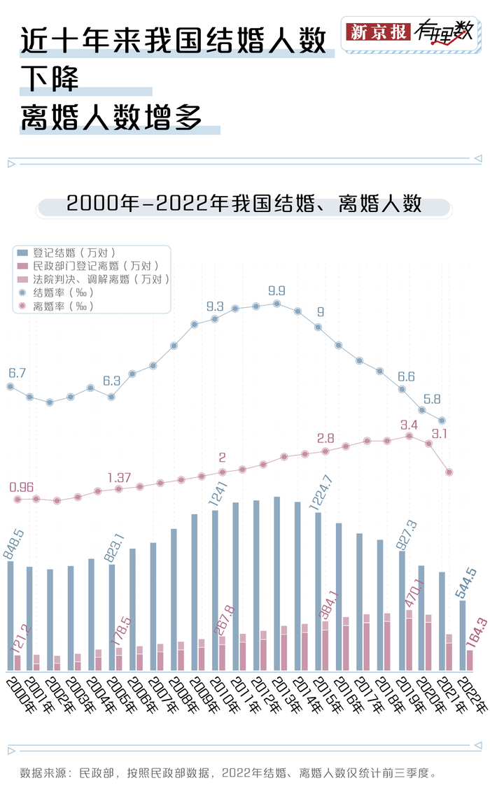 据民政部最新数据,2022年前三季度我国有544.5万对人登记结婚,这个数据同比2021年下降了7.49%;同时有164.3万对夫妻登记离婚,同比增加3.72%。
