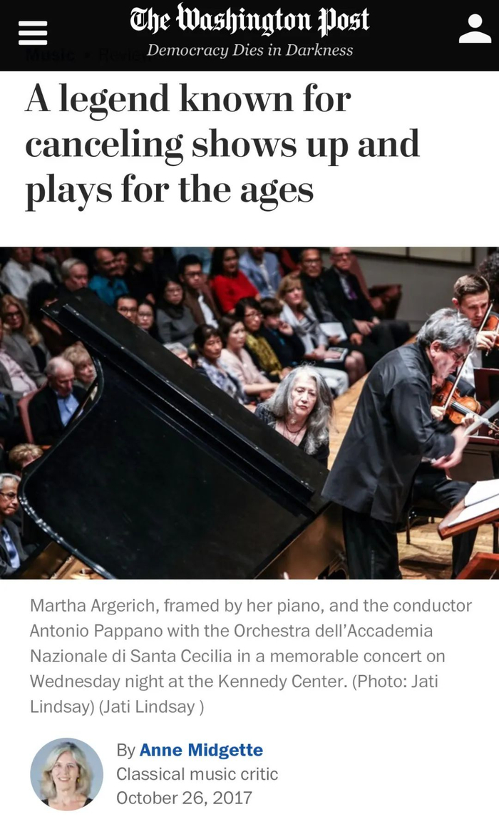 有些钢琴家凭借在台上的演奏引人入胜,传为美谈。有些钢琴家即便不在台上同样扣人心弦,妇孺皆知。玛塔·阿格里奇便是这样一位无论人在台上还是不在台上都自带主角光环、身处聚光灯下的钢琴家。年初,她因心脏健康原因取消了一系列音乐会引发大量传媒关注,人们随之也对她过往取消音乐会的“黑历史”议论纷纷。