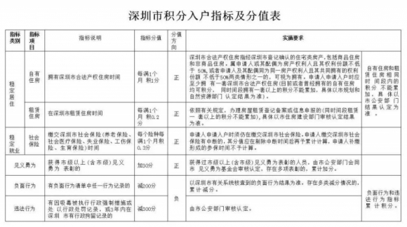 2月15日,深圳施行积分入户最新办法,有效期五年。积分入户指标由居住情况、参加社会保险年限情况、见义勇为情况、负面行为、违法行为等指标组成,入户总积分为各项指标累计积分。