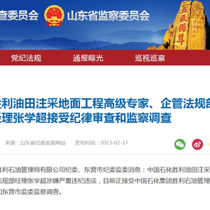 中新经纬2月18日电 山东省纪委监委网站17日通报,中国石化胜利油田注采地面工程高级专家、企管法规部经理张学超,中国石化集团有限公司油气开发领域高级专家李振泉,中国石油化工股份有限公司胜利油田分公司孤东采油厂原党委委员、副厂长刘琮洁涉嫌严重违纪违法被查。