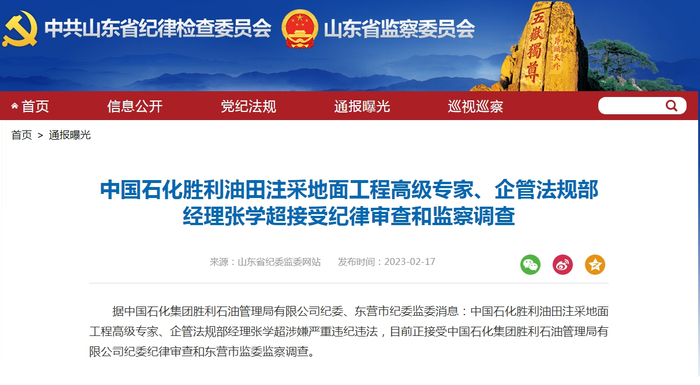 据中国石化集团胜利石油管理局有限公司纪委、东营市纪委监委消息:中国石化胜利油田注采地面工程高级专家、企管法规部经理张学超涉嫌严重违纪违法,目前正接受中国石化集团胜利石油管理局有限公司纪委纪律审查和东营市监委监察调查。