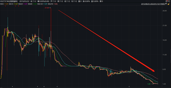 2018年1月份,该股股价最高为27元;截至2023年2月17日收盘,其股价为0.65元,总市值约1.4亿元,较最高时的56亿元市值,缩水超97%。