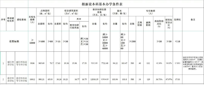 在《拟新设本科基本办学条件表》中,申请建校名称为丽江师范学院、德宏师范学院,建校基础分别为丽江师范高等专科学校、德宏师范高等专科学校。其中,两所高校生师比、高级职称占比、在校生规模、占地面积、教学科研仪器设备等标准超过设置标准要求。