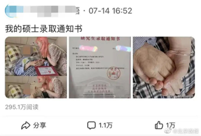 在被保研到华东师范大学后,郑灵华在爷爷的病床前记录下了和爷爷分享录取通知书的瞬间,照片里的她留着粉色中长发。