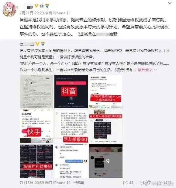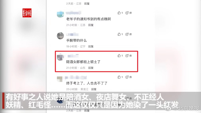 说到染粉色头发的初衷,她说希望毕业照上的自己能是明媚而鲜艳的。没想到的是,这条记录生活的动态内容被盗用,有营销号搬了她的图,编出“专升本”的故事,卖起了课,许多人针对她的粉色头发,辱骂她“陪酒女、夜店舞女、不正经……”甚至还有人攻击她生病的爷爷,造谣称“老人带病考取研究生,还娶了一个小女生”。