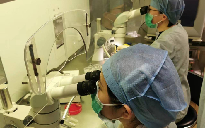两位医生在显微镜下对小欣的卵巢组织进行剥离等操作。