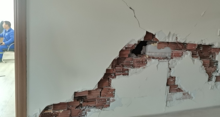 一走进大楼,到处可见裂缝和掉落的墙皮,墙体变形导致房间的房门关不上,想起每天都会发生余震,队员们心里打起了鼓:“余震来了,跑得掉吗?”