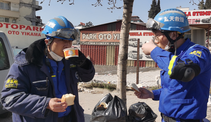 “有饭吃就很不错了!”对于饮食,蓝天队员不讲究也不挑剔,他们反而觉得当地的餐食供应做得非常好。潘实成说,供食点分布在城市的主要街头,不管是哪国的救援队,只要到那就会有人提供食物,甚至还有瓶装水,“对于灾区而言,这已经是非常不错的后勤保障了,他们把自己最好的东西都拿出给救援队,而且还不断有当地百姓、志愿者将食物送到救灾的作业点,救援队饿不着,只是有时候忙于救援忘记了吃饭。”