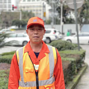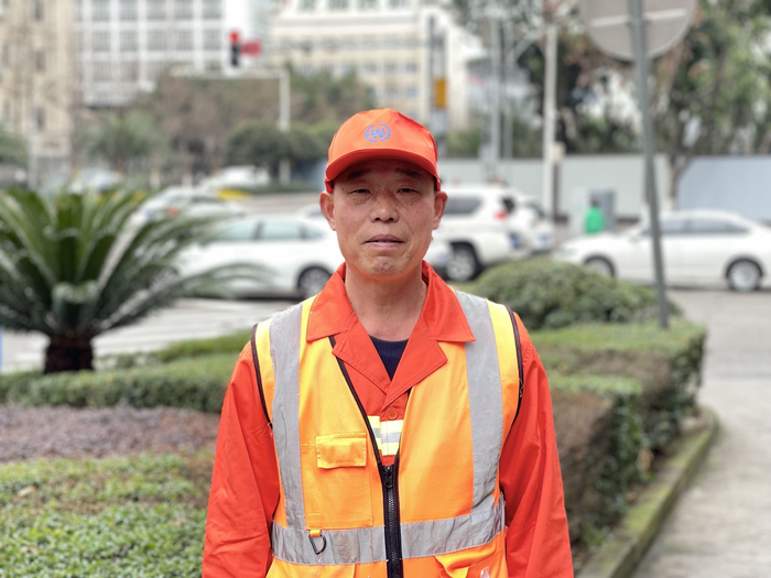每逢夏日,他顶着炎炎烈日在路段上工作,长时间的暴晒将他的皮肤晒成了古铜色,橙色的环卫服也褪色发白,这让他与其他同事形成了鲜明对比——既是他辛苦工作的见证,也是他最好的军功章。