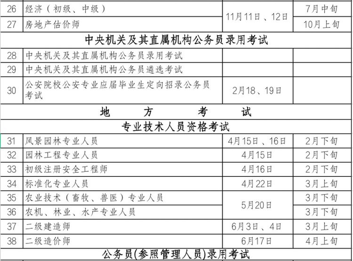 其中,全国专业技术人员资格考试27项,地方专业技术人员资格考试8项,中央机关公务员考试3项,地方公务员录用考试2项,市级机关遴选公务员考试1项,事业单位聘用考试4项,事业单位工勤人员转岗考试1项,招募三支一扶考试1项,事业单位公开招聘西藏籍高校毕业生考试1项。