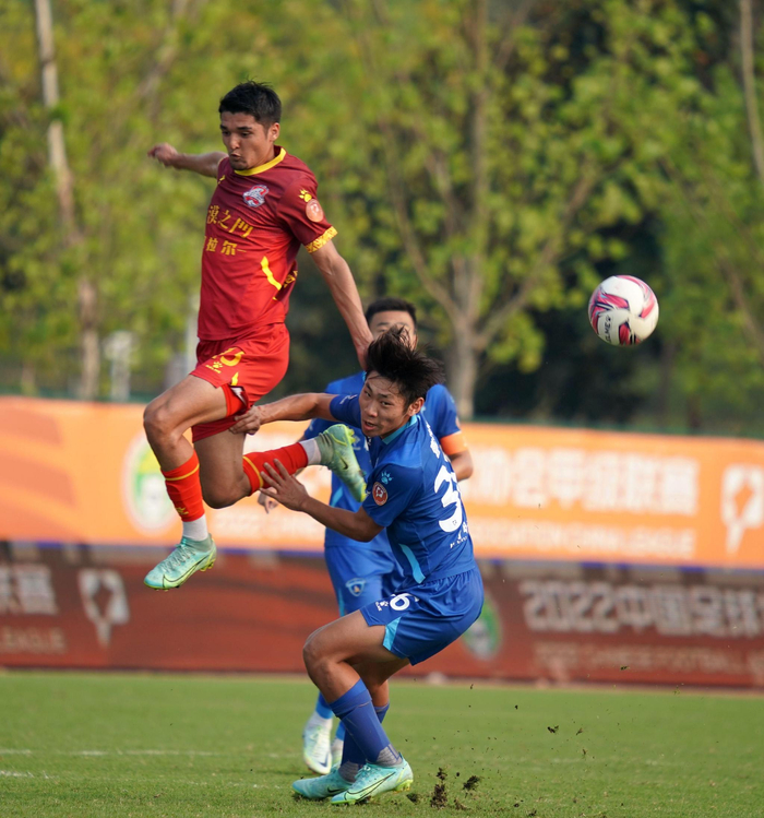 2022年9月11日,中甲联赛第20轮,新疆天山雪豹不敌南京城市,雪豹球员在拼抢中高高跃起。 图/IC photo