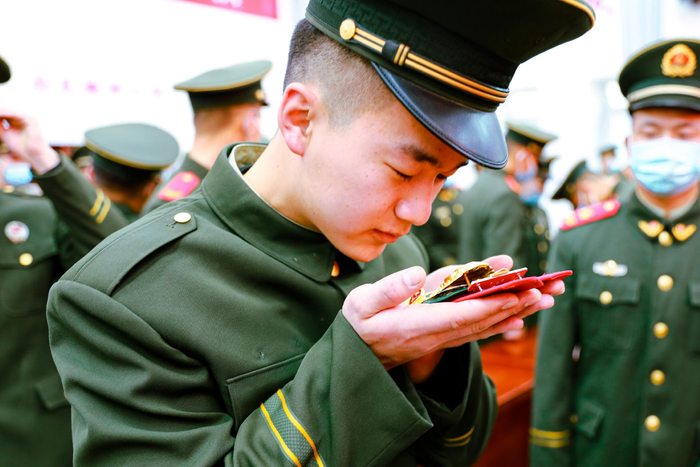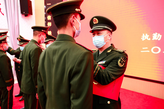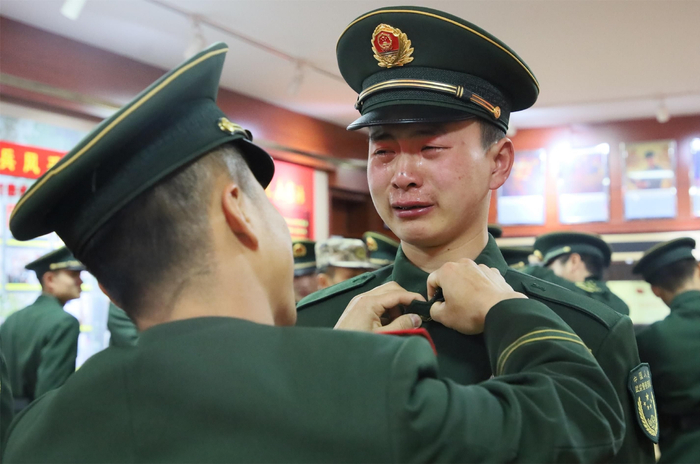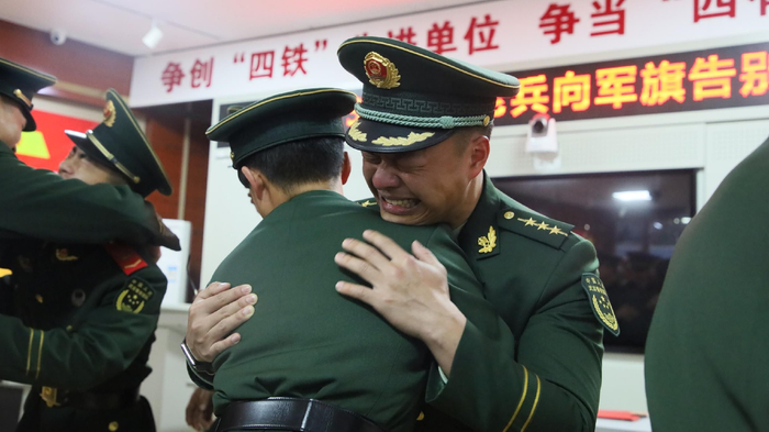 仪式结束后,在催人泪下的乐曲中,退役老兵强忍住泪水互相拥抱,依依惜别。即将退役的士官宋瑞祥说道:“当兵这5年来,从一名懵懂无知的社会青年逐渐成长为一名合格的武警战士,我学会了顽强拼搏,学会了不断超越自我,在未来的征途中,我会用我在部队学到的本领,继续努力奋斗、不忘初心、争取再创辉煌!”