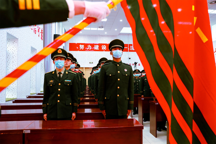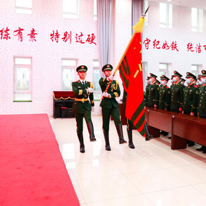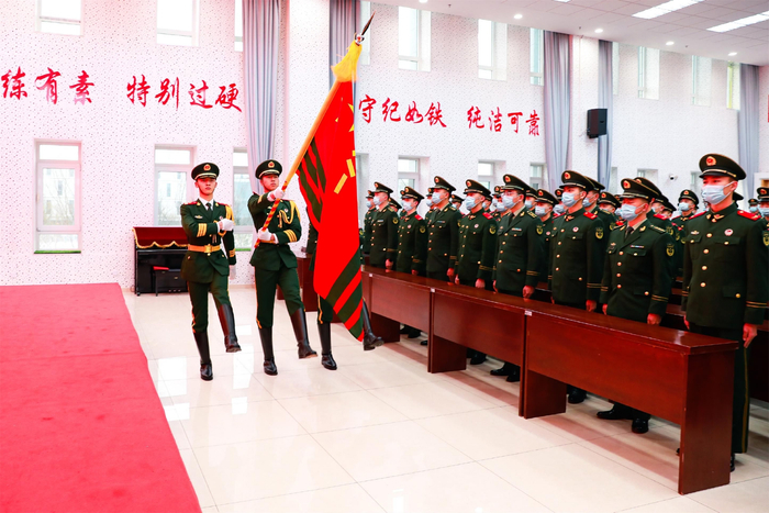 “迎武警部队旗……向武警部队旗敬礼!”上午9时,伴随着一声响亮的口令,三名英姿飒爽的护旗手迈着矫健整齐的步伐将鲜艳的武警部队旗护送进场。