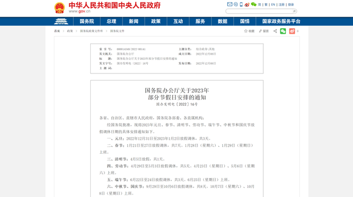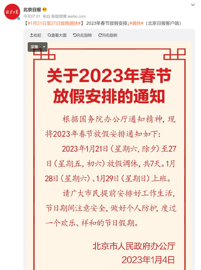 国务院办公厅此前发布通知称,“春节:1月21日至27日放假调休,共7天。1月28日(星期六)、1月29日(星期日)上班。”