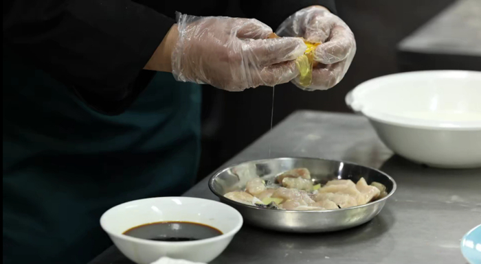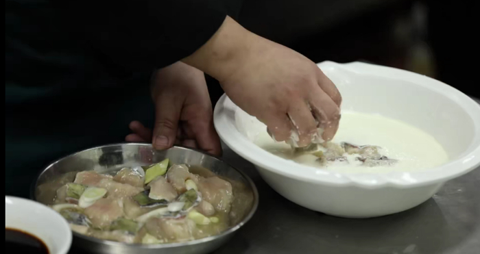 所用的是运河中野生的两须鲶鱼,现捞现做,煮鱼也用大运河的水,鲶鱼用纯绿豆淀粉裹好,香油红烧,三炖三烤,勾芡出锅一道鲜,美的野生鲶鱼就诞生了!