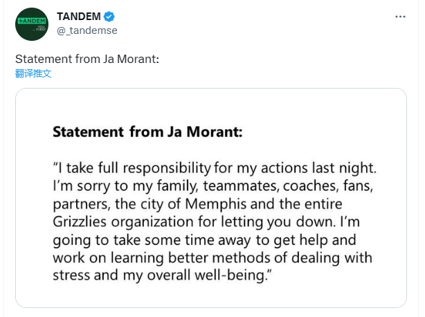 目前,莫兰特关停了自己的社交媒体账户,他在当地时间周六通过代理人发布了致歉声明,“我对我昨晚的行为负全责,很抱歉让我的家人、队友、教练、球迷、伙伴以及整个孟菲斯失望了。我打算花点时间去寻求帮助,学习更适当的方式来应对压力和个人状态问题。”