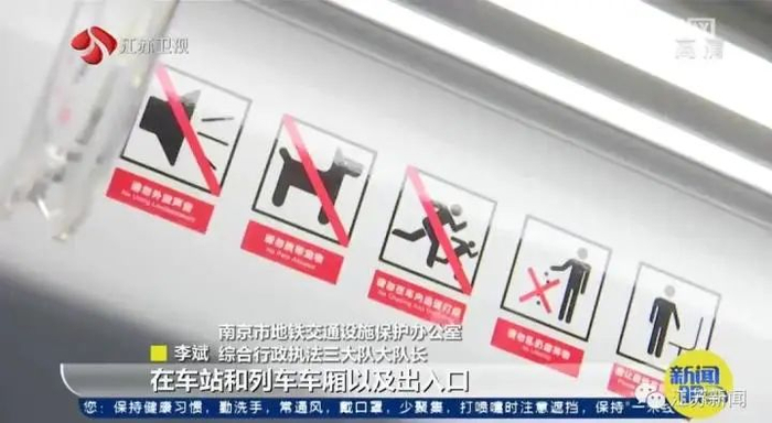 “对此,南京地铁也在列车车厢里面通过语音做了相应的提示,在车站和列车车厢以及出入口张贴了相应的禁止标志,还专门设计了相应的告知单。”李斌说。