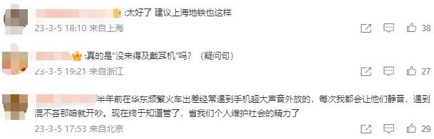 不少网友表示终于有人管这事了,建议全国推广,不仅仅是在地铁上,高铁、动车、所有公共场合都适用。