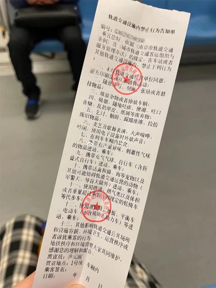 去年5月,南京市地铁交通设施保护办公室综合行政执法三大队大队长李斌说,“我们的执法队员在巡查到小龙湾到百家湖站区间的时候,发现有一名女乘客正在用手机外放声音看视频。执法队员就根据相关的规定上前进行了劝阻,并开具了告知单。这名女乘客全程还是比较配合的,在告知单上面签了个字。”