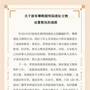 3月10日,北京警方发布消息,针对媒体报道的“有游客在圆明园攀爬遗址”情况,海淀警方经工作,已将申某某等涉案人员查获,案件正在进一步工作中。